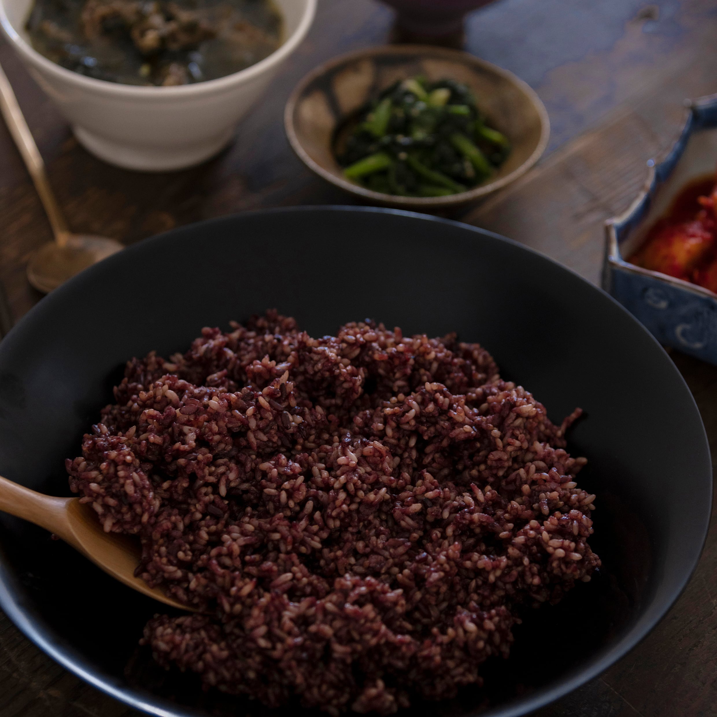 アントシアニンが炊飯時に溶け出し、ポリフェ玄米を美しく染め上げます。